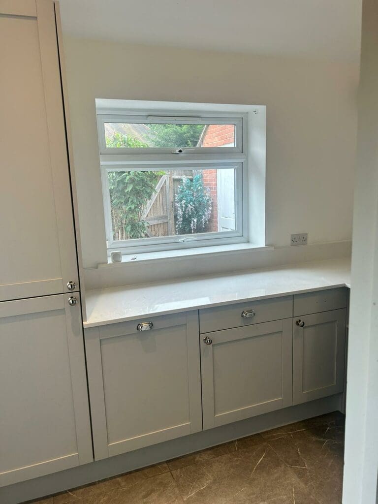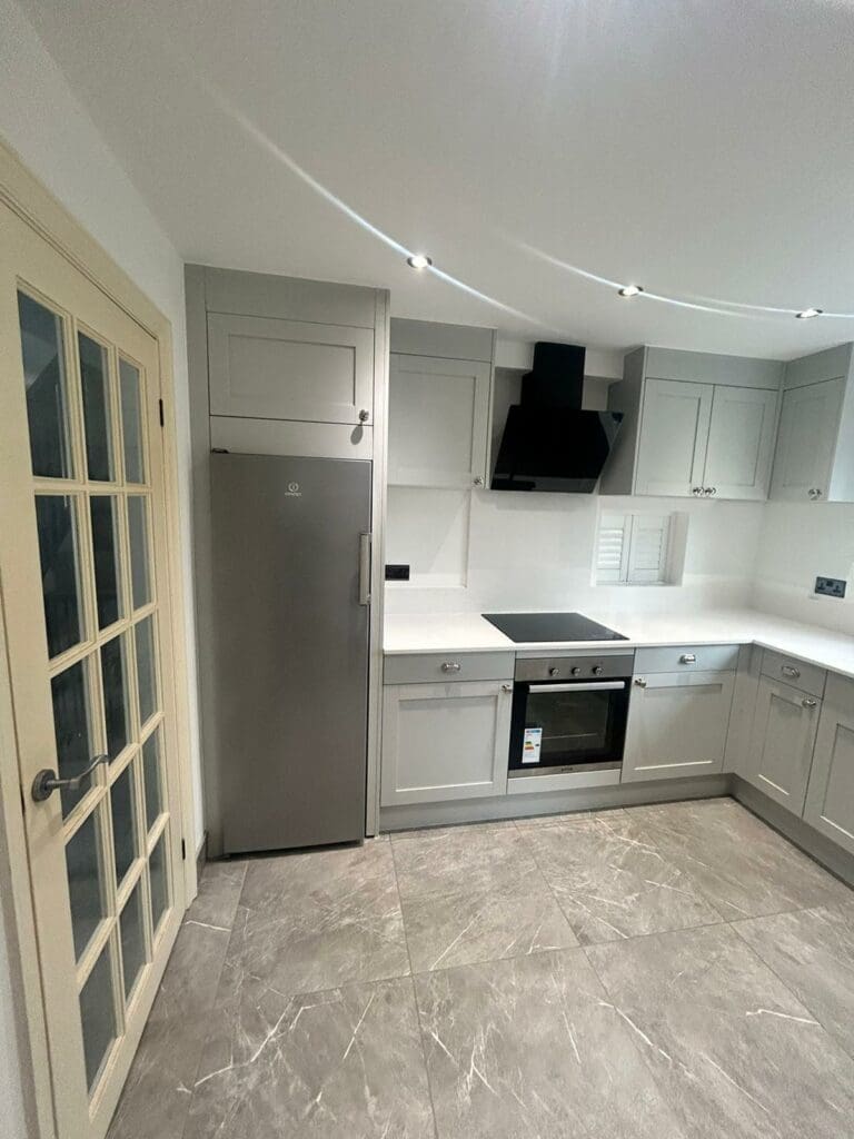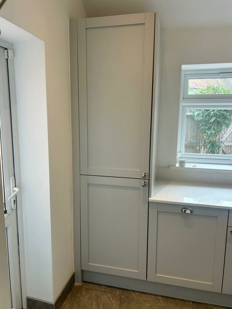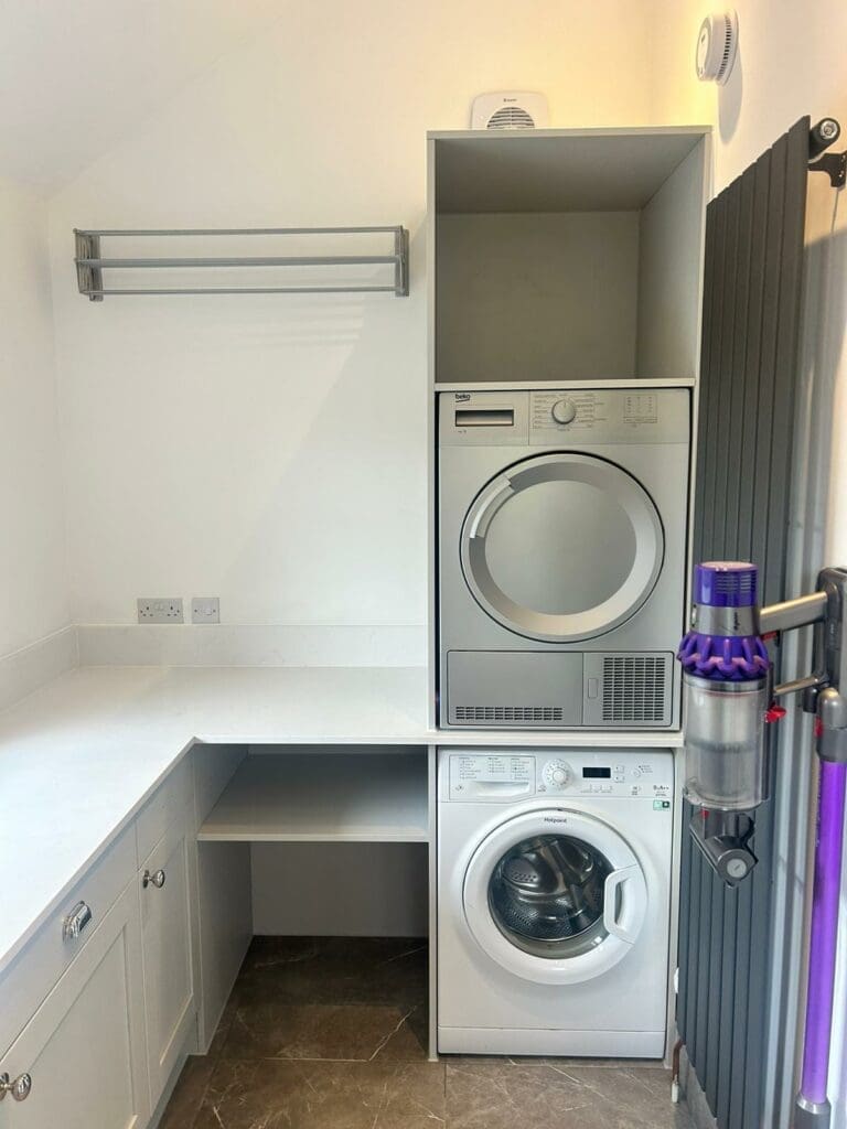 Matt pastel cabinets with stainless steel finishes and separate utility room