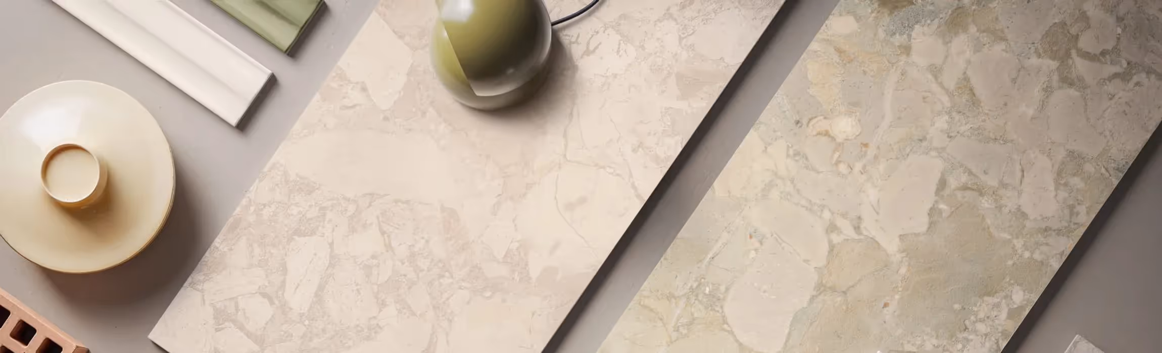 The collection includes natural stone tiles, marble and limestone formats, porcelain floor tiles, ceramic wall tiles, and mosaics. We help you choose formats and finishes for each room.