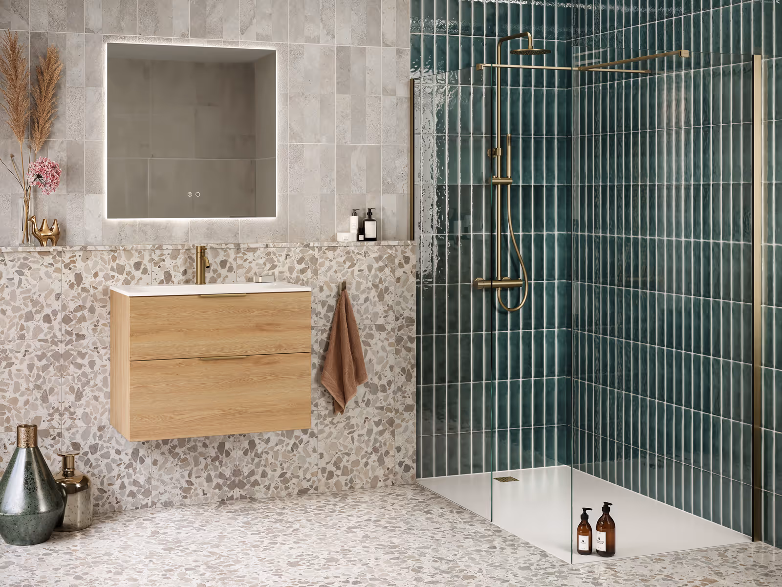 Luxury ensuite shower room featuring Ca' Pietra East Village Grigio tiles, Amtico Beachcomber Oak flooring, and JTP KONO brushed black brassware