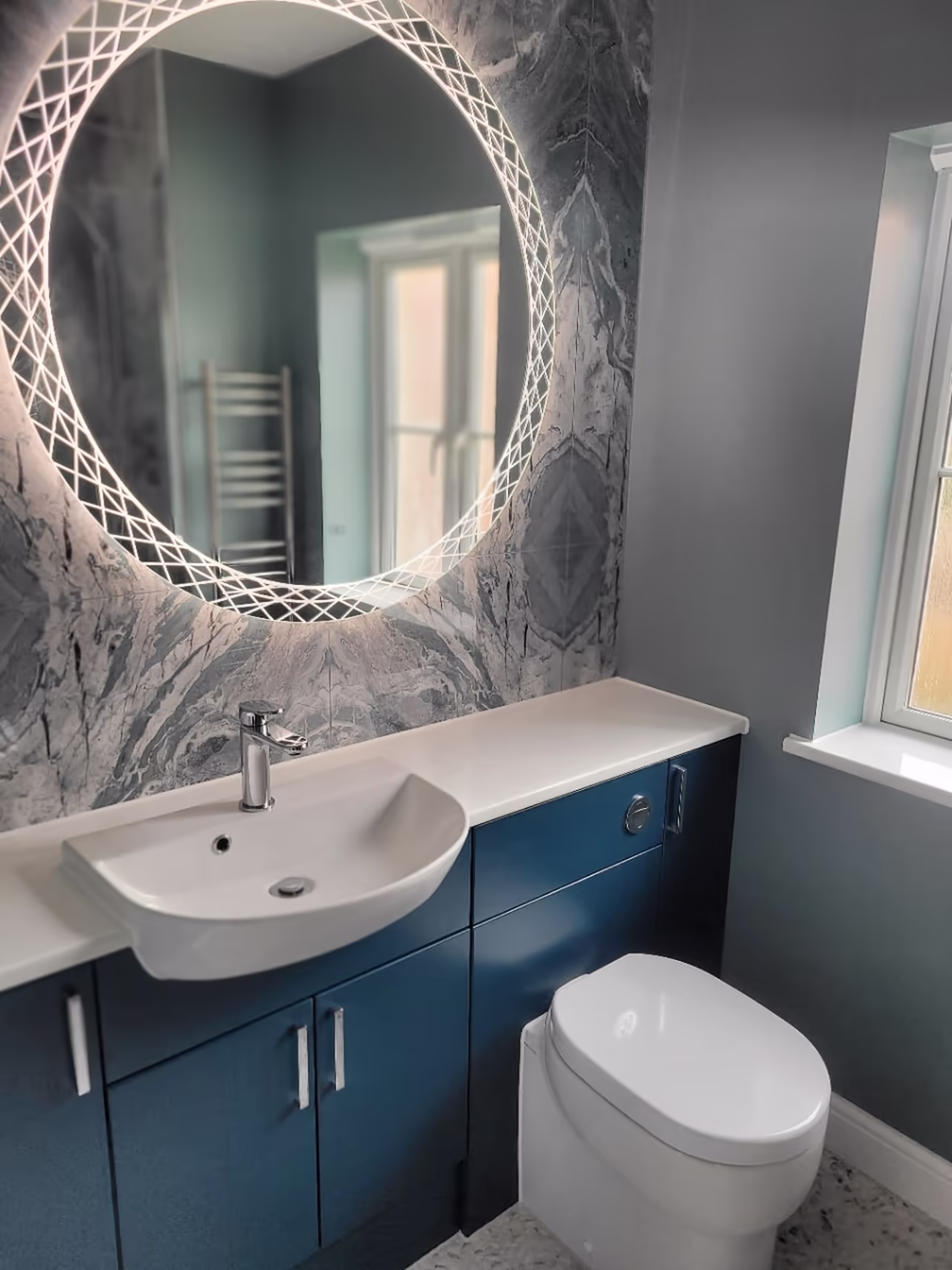 This Highwoods homeowner wanted a wetroom ensuite that felt open and calm. Ca' Pietra Ocean Magnifique bookmatched slabs cover the shower walls — the veining mirrors across the join so it looks like one piece of stone. Porcelanosa Boulder tiles give the floor a soft pebble texture with grip underfoot, and a slim linear drain sits flush with the surface. Roper Rhodes fitted furniture in deep blue keeps things tidy, and the HiB Bellus round mirror adds a decorative glow with its crosshatch LED rim. Warmup underfloor heating runs throughout so bare feet stay warm. Pop into our showrooms to see these brands up close, or learn how we plan your project step by step.